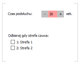 Dodatkowo, oprócz ustawienia maksymalnego czasu podsłuchu w ramach jednej sesji, instalator ma możliwość uzależnienia możliwości podsłuchu od aktualnego stanu stref systemu alarmowego. Domyślnie obie strefy są „odznaczone”, dlatego też podsłuch jest możliwy bezwarunkowo.