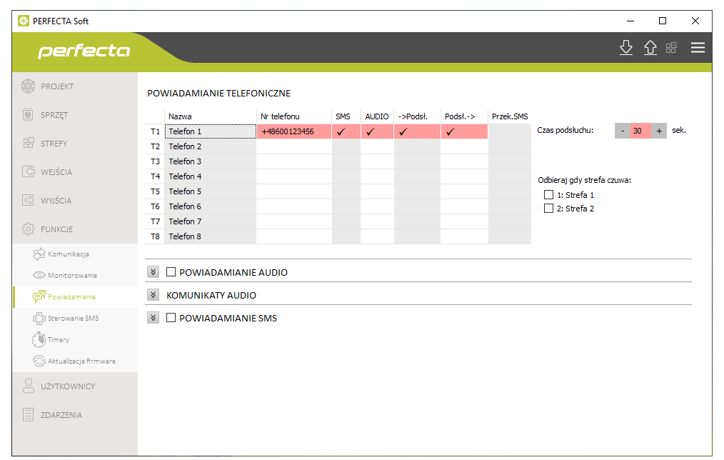 Zaznaczenie przynajmniej jednej strefy zmienia warunki podsłuchu. To rozwiązanie zapobiega możliwości podsłuchiwania domowników lub osób wynajmujących lokal, kiedy aktualnie w nim przebywają. Dla każdej z 8 osób, które są wpisane na listę numerów telefonów do powiadamiania, istnieje możliwość niezależnego ustawienia tych parametrów.