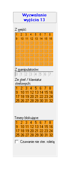 Domyślne parametry wyjścia typu „Roleta w górę” są pokazane na zrzucie. Analogiczne parametry dotyczą wyjścia typu „Roleta w dół”. Wyjścia roletowe mogą być uruchamiane przy użyciu wejść (tabela „Z wejść”). Tabela wskazuje, że naruszenie każdego z wejść spowoduje wyzwolenie wyjścia roletowego. Ten domyślny parametr trzeba zmodyfikować i zaznaczyć tylko te wejścia, które faktycznie będą brać udział w sterowaniu rolety (patrz poprzedni artykuł, gdzie przyciski rolet były podłączone do wejść centrali). Jeżeli więc podłączasz przycisk do wejść centrali, to właśnie w tej tabelce ustawiasz, pod którym numerem wejścia jest „obsadzony” przycisk.