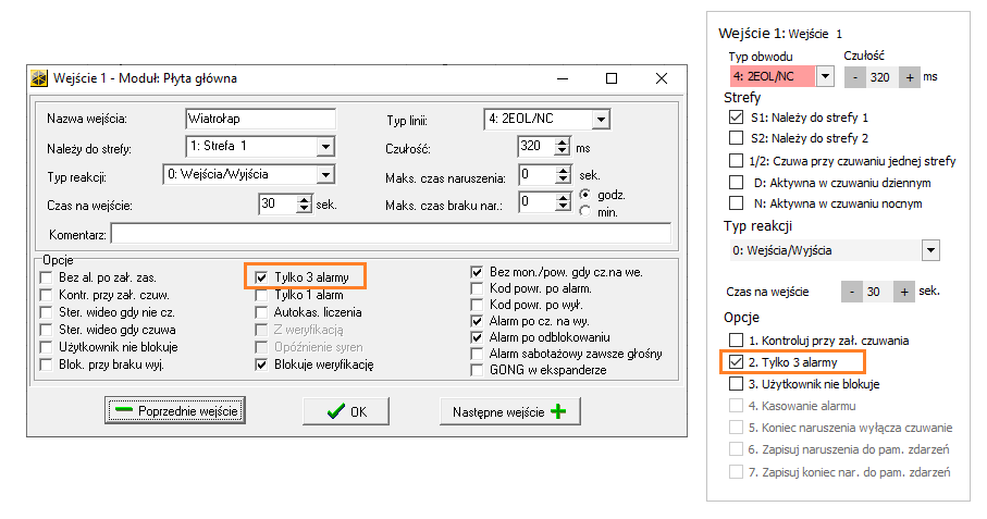Załóżmy, że w systemie jest 5 czujek i każda jest podłączona pod osobne wejście (czyli „książkowo”). Dodatkowo dla każdej czujki (każdego wejścia) jest zaznaczona opcja „Tylko 3 alarmy”. Wniosek jest prosty: