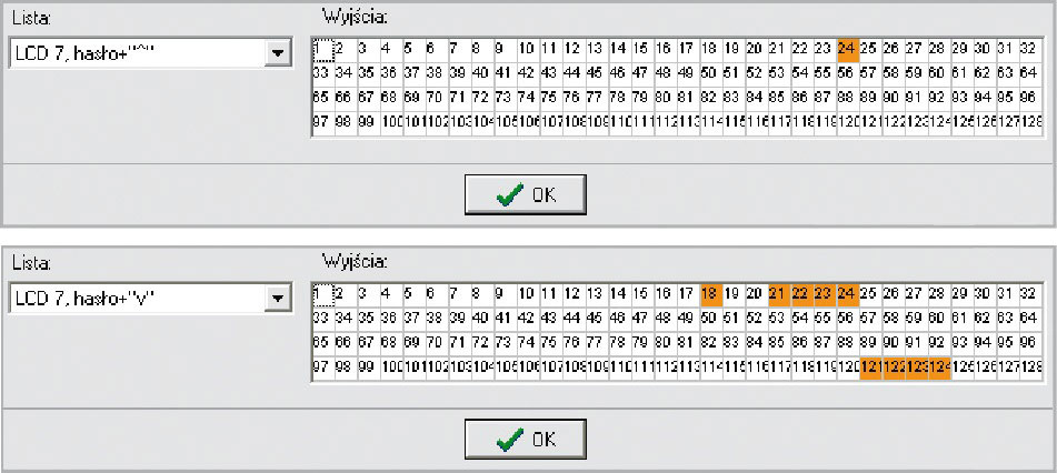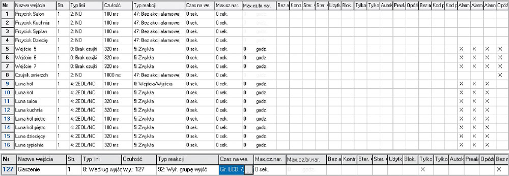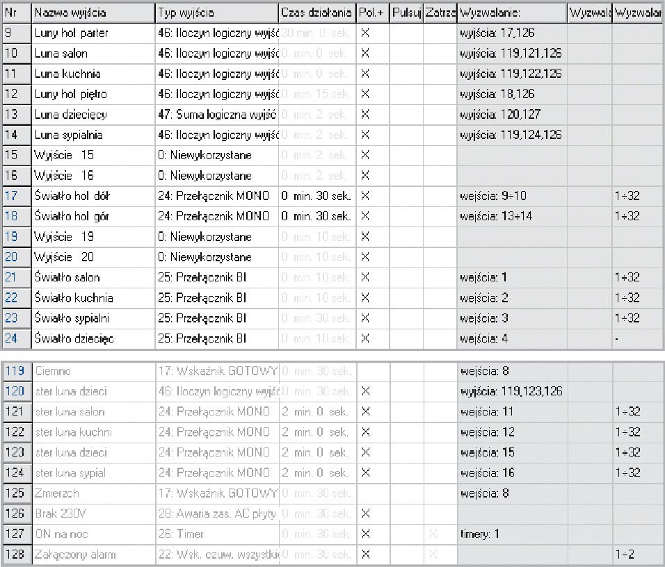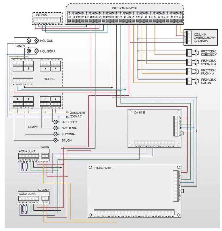 Ekspander wyjść INT-ORS steruje oświetleniem na 230 V. Oświetlenie awaryjne z czujek AQUA Luna sterowane jest za pomocą ekspandera CA-64 O-OC. Wejścia przycisków światła (chwilowych) w pomieszczeniach podłączone są do wejść płyty głównej – dla wejść zapalających światło zmniejszona jest czułość w celu zmniejszenia opóźnienia.