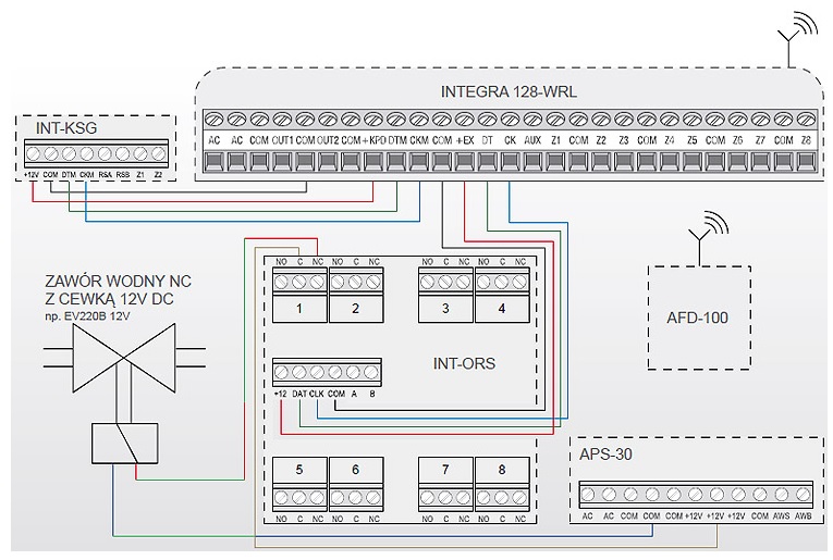 Sygnał z bezprzewodowych czujek zalania AFD-100 jest przekazywany do odbiornika systemu ABAX (stanowiącego część centrali INTEGRA 128-WRL). Następnie centrala przy pomocy ekspandera INT-ORS steruje elektrozaworem, który odcina dopływ wody do mieszkania.