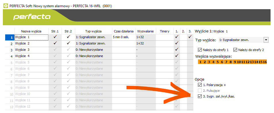 Funkcjonalność jest domyślne dostępna dla wyjścia OUT1 central Perfecta, co widać na poniższym zrzucie: