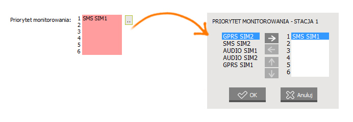 Klikając w przycisk z dwoma kropkami, otwiera się okno, w którym ustalamy kolejność torów w monitorowaniu. Dla tego przypadku wybieramy tylko opcję SMS SIM1. Jest to ważny punkt. Jeżeli nie będzie to zrobiony, SMS’y nie będą wysyłane.