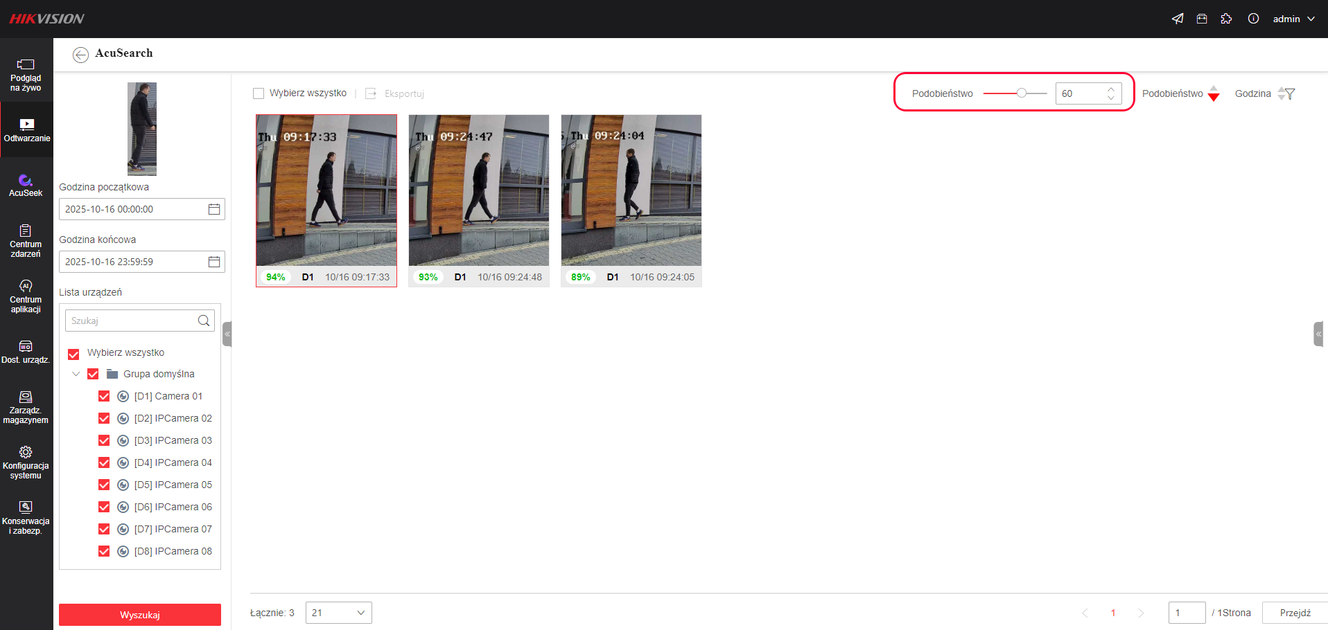 Podczas odtwarzania nagrania użytkownik może uruchomić funkcję AcuSearch i wybrać obiekt, który chce śledzić (Rys. 4). System umożliwia również określenie zakresu przeszukiwania oraz ustawienie progu prawdopodobieństwa, co pozwala dopasować dokładność analizy. Po zakończeniu procesu prezentowane są wszystkie wystąpienia danego obiektu w zarejestrowanym materiale (Rys. 5).