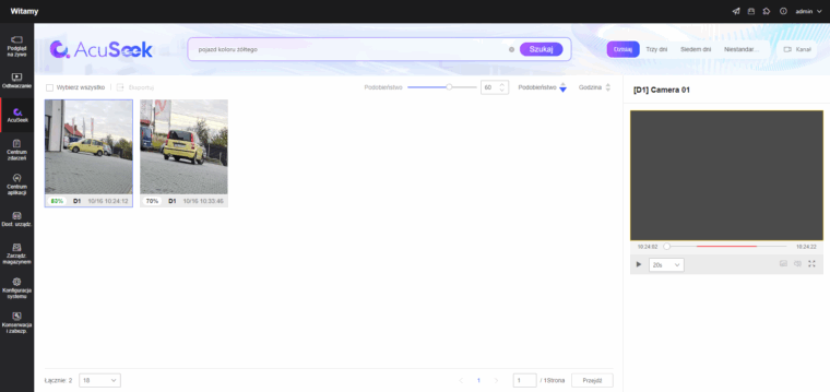 Funkcja AcuSearch to bardziej zaawansowane narzędzie wyszukiwania nagrań, które umożliwia przeszukiwanie całego archiwum — obejmującego wszystkie kamery — pod kątem wybranego obiektu, takiego jak człowiek lub pojazd. Dzięki temu możliwe jest precyzyjne namierzenie danej osoby lub samochodu w całym systemie monitoringu, a także prześledzenie ich ścieżki ruchu czy określenie miejsc, w których się pojawiały.