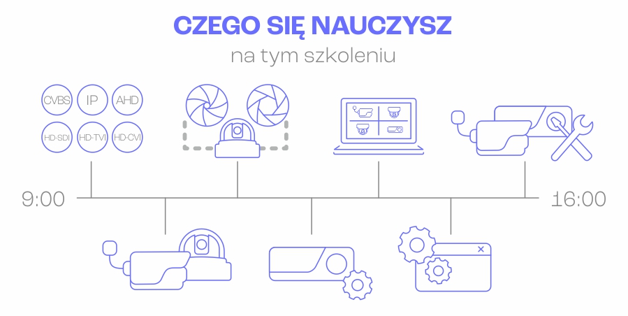 Omawiane są na nim podstawowe zagadnienia związane z planowaniem i budową takich systemów. Uczestnicy szkolenia poznają wszystkie popularne technologie stosowane w monitoringu (CVBS, IP, HD-CVI, itp) a także zdobywają uniwersalną dla każdego z tych systemów wiedzę na temat kamer i innych elementów systemu.