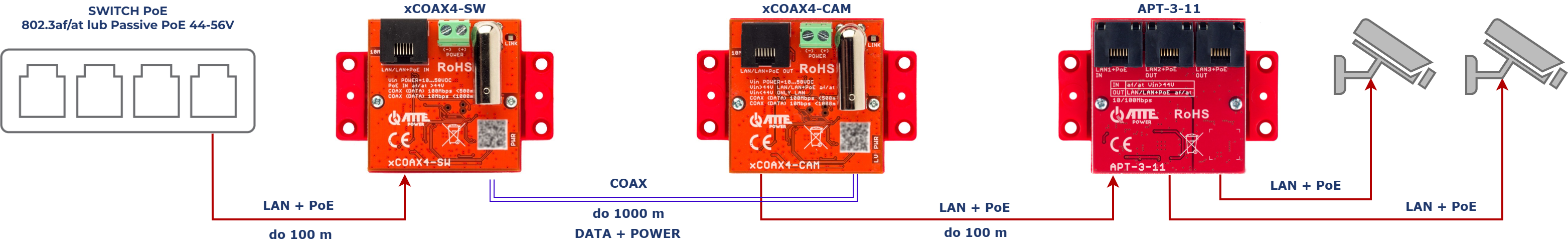 xCOAX4-SET jest zestawem aktywnych konwerterów do transmisji danych z sieci Ethernet oraz zasilania PoE poprzez kabel koncentryczny. W skład zestawu wchodzą xCOAX4-SW oraz xCOAX4-CAM. Urządzenia umożliwiają montaż kamer IP PoE w miejscach, gdzie nieopłacalna lub niemożliwa jest wymiana istniejącego okablowania. Moduł xCOAX4-SW zasilony może zostać przez dowolny switch PoE. Za pomocą kabla koncentrycznego umożliwia dwukierunkową komunikację sieciową oraz zasilanie odbiornika xCOAX4-CAM. Maksymalna długość przewodu koncentrycznego to 1000m.