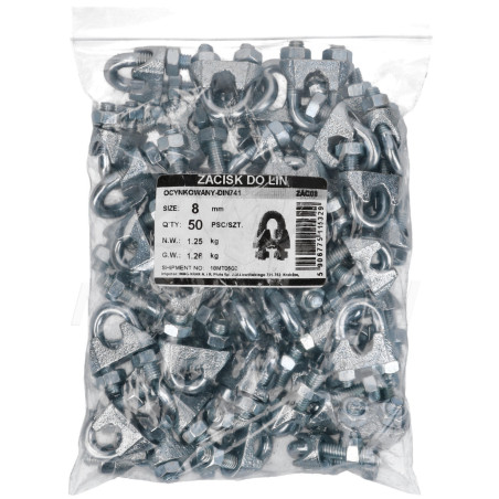 ZAC-08 - Opakowanie ocynkowanych zacisków do lin stalowych. Przy ich pomocy możliwe jest uzyskanie pętli z liny, przez jej zgięcie i zaciśnięcie.